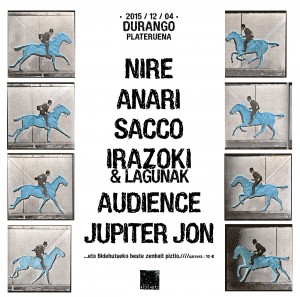 Hauez gain eta Okenek diseinatu duen afitxean ikus dezakezutenez Joseba Irazoki eta Lagunak, Sacco eta Audience izango dira, gutxienez, gaualdi honetan. Zatoz Durangora!