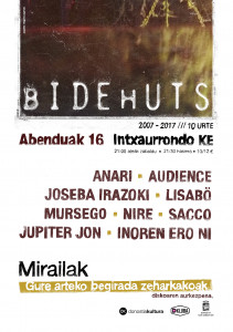 Dakizunez 2017an bIDEhUTSek hamargarren urtemuga du. Duela aste batzuk horren aitzakian disko berezi bat kaleratuko dugula jakinarazi genuen. bIDEhUTSeko taldeen errepertorioaren 10 kanturen berrirakurketa. Berrirakurketa gurutzatuak.